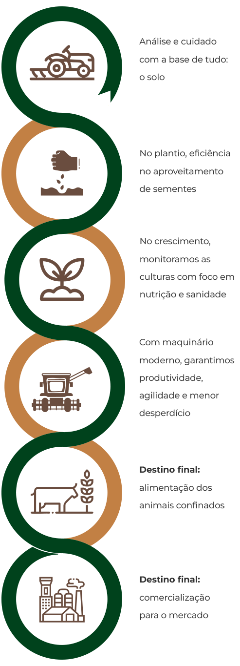 Trabalhamos com manejo consciente, tecnologia no plantio e colheita, e foco na sustentabilidade. A integração entre lavoura e pecuária nos permite aproveitar recursos com inteligência e minimizar desperdícios. Acreditamos que a terra retribui quando é bem cuidada e é por isso que tratamos cada safra com o respeito que ela merece.